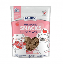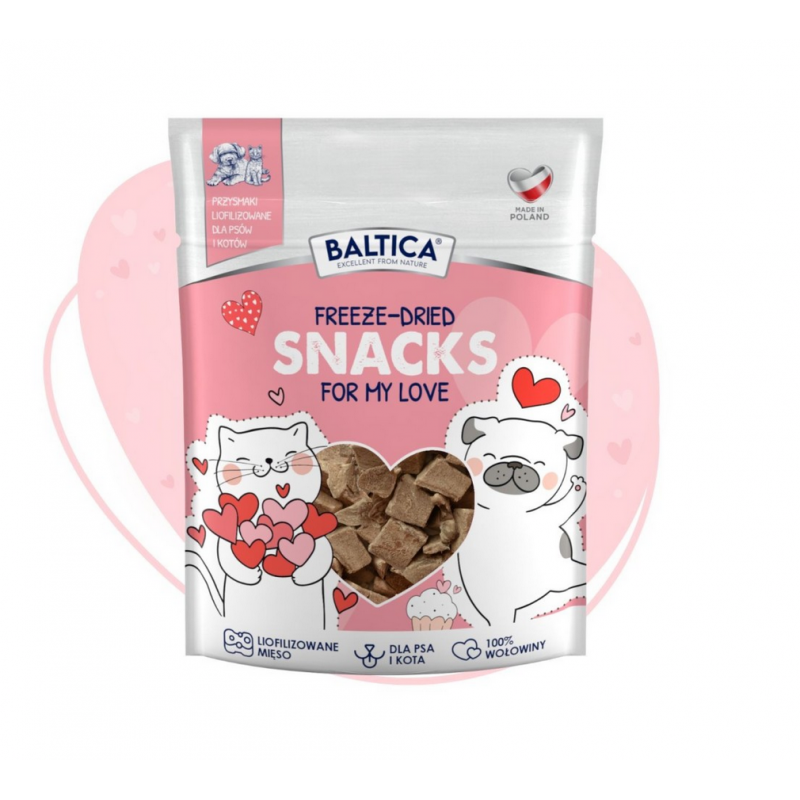 BALTICA SMAKI REGIONÓW Przysmaki Love – liofilizowane serce wołowe Freeze-Dried Snacks For My Love to wyjątkowo czysty, jednoskładnikowy przysmak stworzony z myślą o psach i kotach, które zasługują na naturalną jakość bez kompromisów. Delikatny proces liofilizacji pozwala zachować pełnię wartości odżywczych świeżego mięsa, jego intensywny aromat oraz naturalną strukturę.