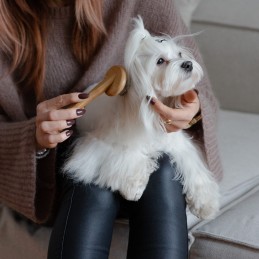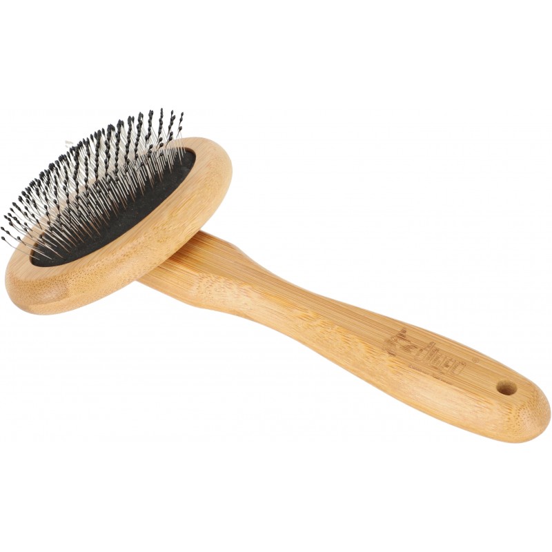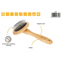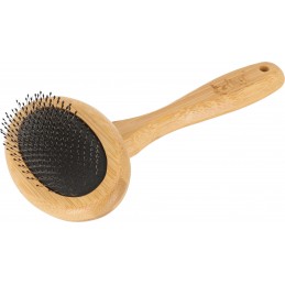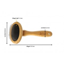 Wykonana z naturalnego, ekologicznego włókna bambusowego owalna szczotka z metalowymi igłami zakończonymi plastikowymi kuleczkami to produkt, który sprzyja dbaniu nie tylko o zwierzę, ale też o środowisko. Przeznaczona jest do dłuższej sierści ze skłonnościami do kołtunienia i filcowania się. Ułatwia wyczesać martwe włosy jednocześnie wygładzając sierść. Gładko zakończone igły szczotki podczas wyczesywania, delikatnie masują skórę czworonoga. Zwierzątko należy czesać krótkimi ruchami, ściągać wyczesaną sierść, a następnie kontynuować czesanie.