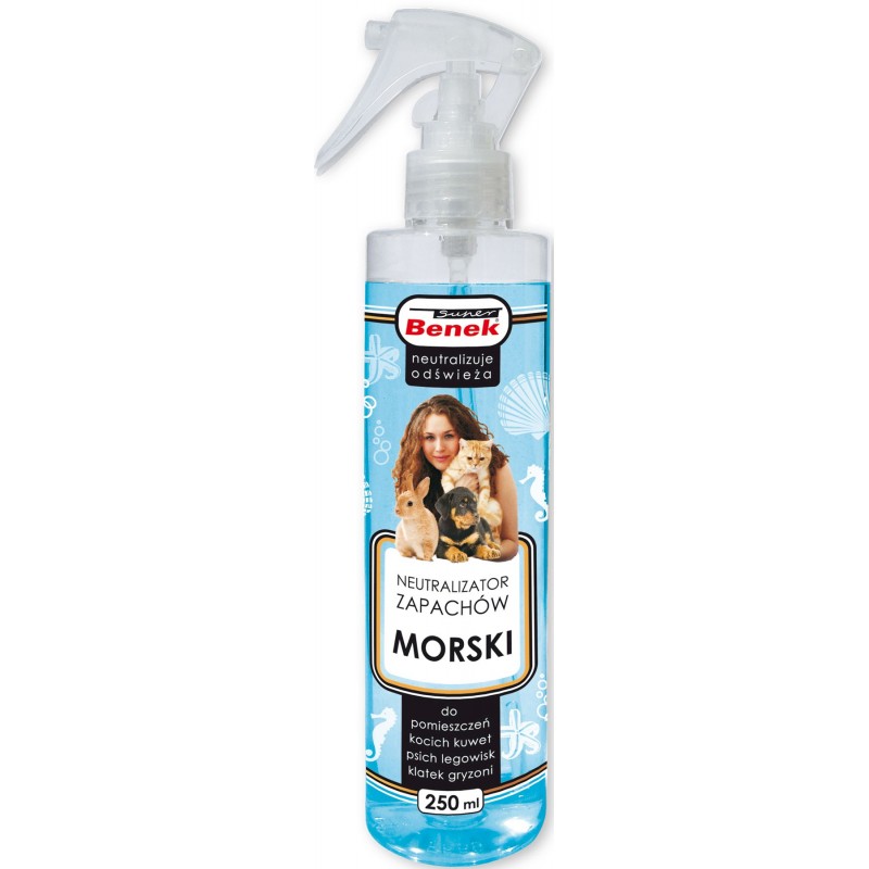 SUPER BENEK Morski to nowoczesny neutralizator zapachów stworzony z myślą o domach, w których mieszkają zwierzęta. Dzięki zastosowaniu skutecznych składników i delikatnego aromatu morskiej bryzy preparat efektywnie eliminuje nieprzyjemne zapachy i wprowadza do pomieszczenia poczucie świeżości. Formuła wzbogacona o naturalne olejki eteryczne działa relaksująco i jest w pełni akceptowana przez zwierzęta domowe.