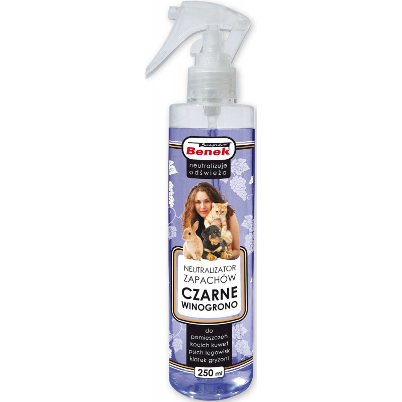 SUPER BENEK Czarne Winogrono to nowoczesny neutralizator zapachów, stworzony z myślą o właścicielach zwierząt domowych, którzy pragną zachować świeżość i przyjemną atmosferę w pomieszczeniach. Innowacyjna formuła skutecznie usuwa nieprzyjemne zapachy, nie maskując ich, ale eliminując u źródła. Delikatny, winogronowy aromat – akceptowany przez wszystkie zwierzęta – działa relaksująco dzięki zastosowaniu naturalnych olejków eterycznych.