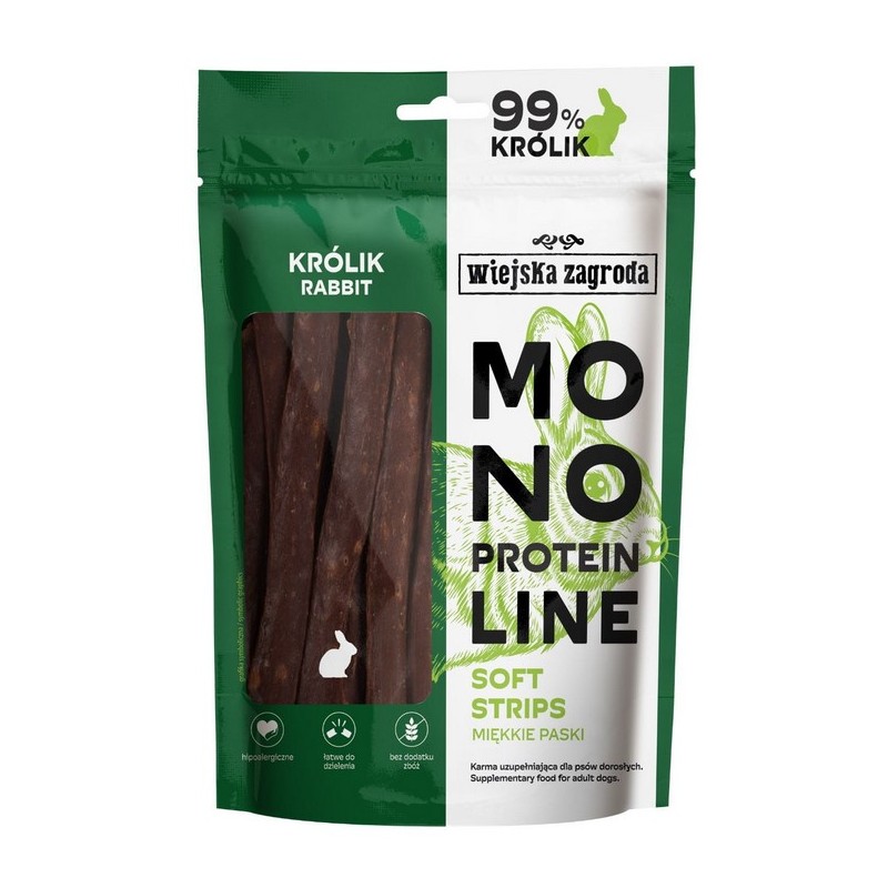 WIEJSKA ZAGRODA PIES Przysmak Monoproteinowy Miękkie Paski Królik 100g to idealna przekąska dla psów, zwłaszcza tych z wrażliwym układem pokarmowym i skłonnością do alergii. Wykonane z 99% mięsa królika, stanowią cenne źródło lekkostrawnego białka, które wspomaga zdrowie i witalność pupila. Bezzbożowa i bezglutenowa formuła czyni ten przysmak idealnym wyborem dla psów wymagających specjalnej diety.