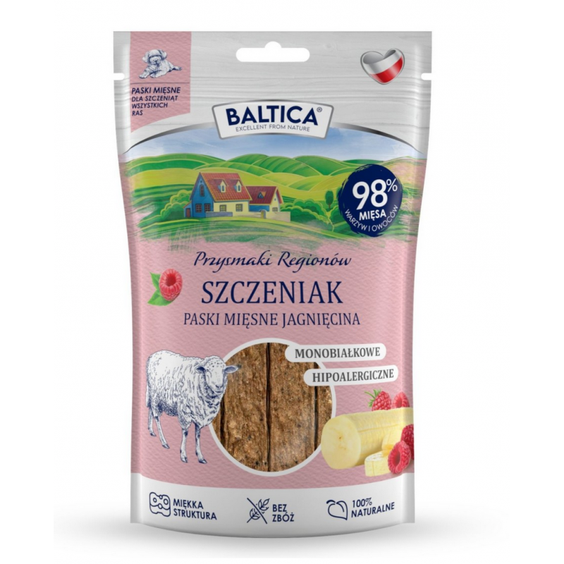 BALTICA PRZYSMAKI REGIONÓW Mięsne Paski dla Szczeniąt Jagnięcina to naturalny, monobiałkowy przysmak stworzony z myślą o zdrowym rozwoju młodych psów. Wysokiej jakości jagnięcina stanowi delikatne, łatwo przyswajalne źródło pełnowartościowego białka, szczególnie polecane szczeniętom powyżej 3. miesiąca życia oraz psom wrażliwym i skłonnym do alergii pokarmowych. Bogactwo cennych aminokwasów wspiera prawidłowy rozwój mięśni i całego organizmu w kluczowym okresie wzrostu.
