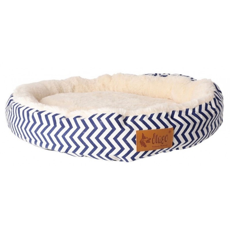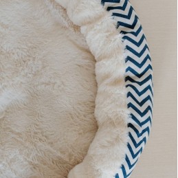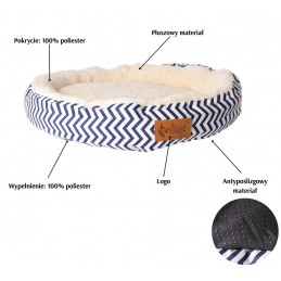 Charakterystyczny wzór w niebieskie zygzaki na tle ecru sprawia, że legowisko doskonale prezentuje się w jasnych, nowoczesnych wnętrzach. Zewnętrzna warstwa wykonana z trwałego poliestru jest odporna na codzienne użytkowanie i łatwa w utrzymaniu czystości, a antypoślizgowy spód zapobiega przesuwaniu się legowiska na panelach, płytkach czy parkiecie.
