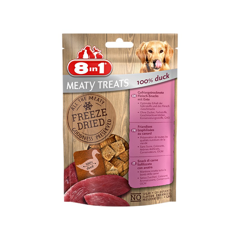 Mięsne Przysmaki 8in1 to znakomite przekąski, które sprawią przyjemność Twojemu zwierzęciu. Produkty zawierające 100% piersi z kaczki zachowują pełną wartość mięsa. Składniki zostały poddane delikatnemu procesowi liofilizacji, który pozwala zachować pełną wartość i wspaniały smak mięsa.