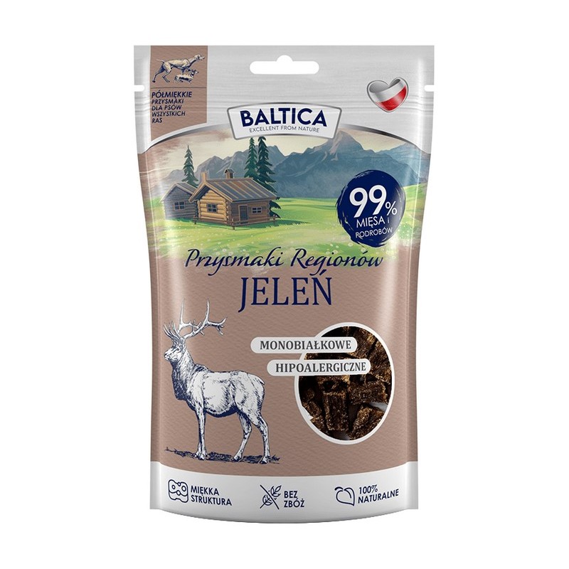 BALTICA PRZYSMAKI REGIONÓW półmiękkie jeleń to naturalne przysmaki treningowe dla psów, oparte na wysokiej zawartości mięsa z jelenia. Monoproteinowa formuła bez dodatku zbóż, sztucznych barwników, konserwantów i aromatów sprawia, że przysmaki minimalizują ryzyko alergii, oferując zdrową nagrodę podczas treningów i zabaw. Półmiękka struktura sprawia, że są idealne dla psów o wrażliwych dziąsłach i zębach, dostarczając im smacznej i naturalnej przekąski.