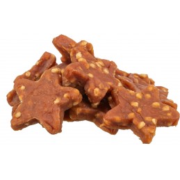 TRIXIE PREMIO Stars to pyszna przekąska dla psów, stworzona z myślą o codziennym smakołyku do żucia. Składa się w 93% z mięsa, łącząc delikatnego kurczaka z lekkostrawnym ryżem, co czyni ją doskonałym wyborem dla psów preferujących naturalny smak i wysoką jakość. Dzięki braku dodatku cukru przysmak wspiera zdrową dietę, a jego miękka konsystencja sprawia, że idealnie sprawdza się jako nagroda podczas treningu lub smaczna przekąska między posiłkami.