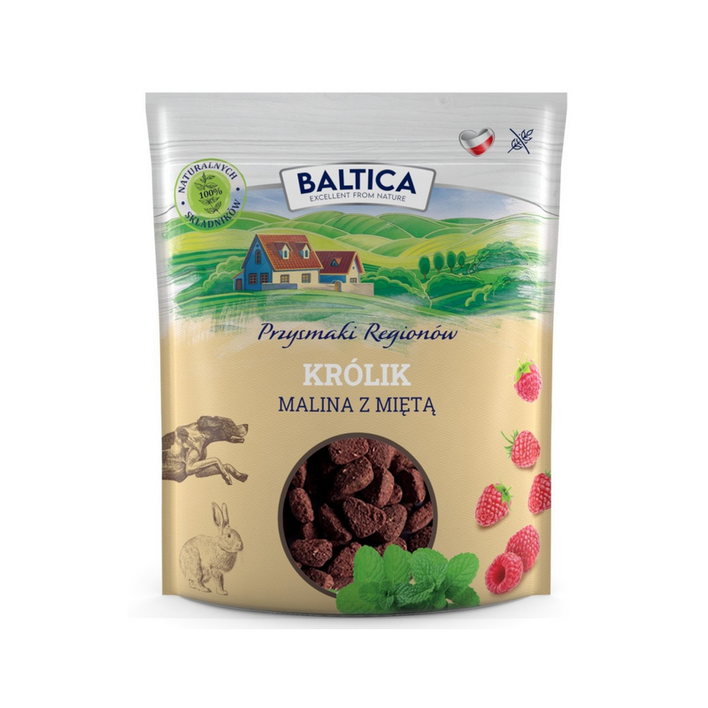 BALTICA PRZYSMAKI REGIONÓW Królik z maliną i miętą 100g to naturalne przysmaki treningowe dla psów, stworzone na bazie delikatnego mięsa z królika z dodatkiem malin, jabłek i mięty. Idealne na spacery, treningi i zabawy, zapewniają zdrową nagrodę, jednocześnie ograniczając ryzyko reakcji alergicznych. Przysmaki są bezzbożowe i nie zawierają konserwantów, gliceryny, barwników, aromatów ani wzmacniaczy smaku, co czyni je bezpiecznym wyborem dla psów z wrażliwym układem pokarmowym.