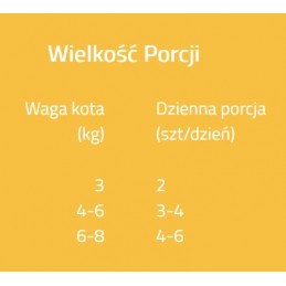 Zalecana dawka dobowa jest podana w tabeli żywienia, jednak należy dostosować ilość karmy do indywidualnych potrzeb kota, w zależności od jego wieku, aktywności i środowiska. Pamiętaj o stałym dostępie do świeżej wody i przechowuj otwartą saszetkę w lodówce.