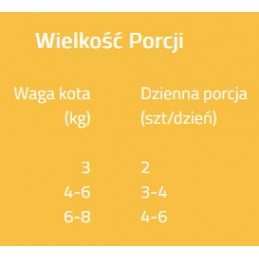 Zalecana dawka dobowa została podana w tabeli żywienia, ale może się różnic w zależności od wieku kota, jego aktywności oraz środowiska w którym żyje. Zawsze należy zapewnić kotu dostęp do świeżej wody. Podawać w temperaturze pokojowej. Jeżeli podajesz karmę w celu zwiększenia różnorodności i smaku, pamiętaj o obniżeniu zalecanej dawki regularnego codziennego posiłku Twojego kota.
