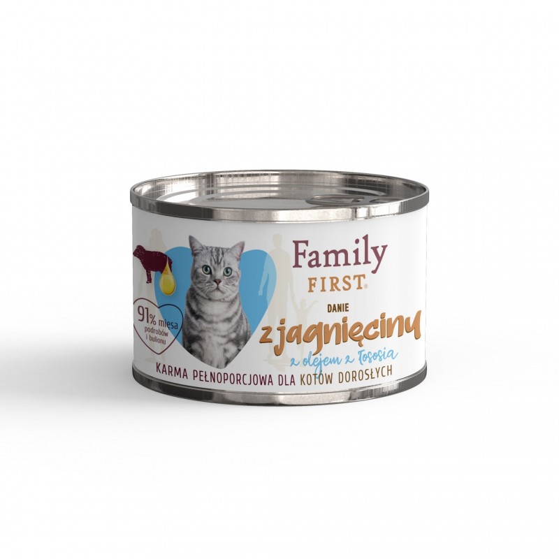 FAMILY FIRST Danie z Jagnięciną dla kota 200 g to pełnoporcjowa mokra karma dla kotów dorosłych, łącząca wysoką zawartość mięsa z funkcjonalnymi dodatkami wspierającymi zdrowie i witalność. Starannie dobrana receptura bez pszenicy sprawia, że karma jest łatwo przyswajalna i odpowiednia również dla wrażliwych kotów.