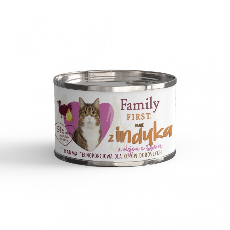 FAMILY FIRST Danie z Indykiem to starannie skomponowany, mięsny posiłek, który wspiera prawidłową masę ciała, zdrowie serca oraz piękną kondycję kota. To codzienna porcja jakości i troski zamknięta w wygodnej puszce 200 g.