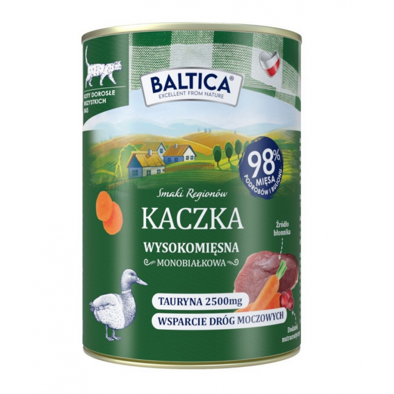 Baltica Karma mokra dla kota – Kaczka, puszka to wykwintna propozycja żywieniowa stworzona z myślą o najbardziej wymagających kotach. Ta monobiałkowa, bezzbożowa formuła oparta jest wyłącznie na wysokiej jakości mięsie z kaczki, dzięki czemu idealnie sprawdzi się również u kotów z wrażliwym układem pokarmowym lub nietolerancjami. Delikatna, soczysta konsystencja i naturalny aromat zachęcają nawet wybredne koty do posiłku.