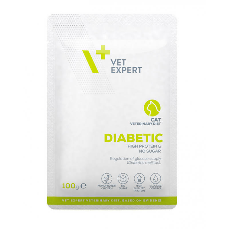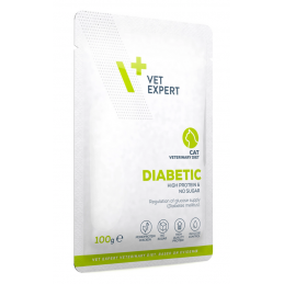 VETEXPERT 4T Vet. Diet Diabetic Cat 100 g to specjalistyczna karma weterynaryjna dla kotów dorosłych, opracowana z myślą o wsparciu regulacji poziomu glukozy we krwi u zwierząt cierpiących na cukrzycę (Diabetes mellitus). Starannie dobrana receptura pomaga stabilizować metabolizm i wspiera codzienne funkcjonowanie kota z zaburzeniami gospodarki cukrowej.