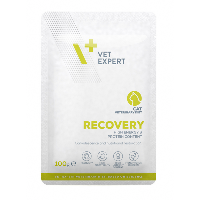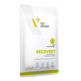 VETEXPERT 4T Vet. Diet Recovery Cat 100 g to specjalistyczna karma weterynaryjna dla kotów dorosłych, przeznaczona do stosowania w okresie rekonwalescencji, po przebytych chorobach, zabiegach lub w sytuacjach wymagających intensywnego wsparcia żywieniowego. To skoncentrowana, wysokoenergetyczna dieta, która pomaga szybko odbudować siły i wrócić do dobrej kondycji.
