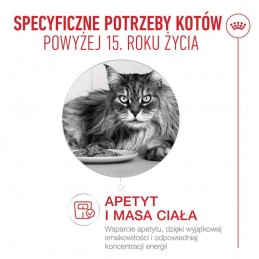 Mokra karma ROYAL CANIN® AGEING 15+ delikatny mus, opracowana została specjalnie dla kotów w wieku powyżej 15 lat. Receptura karmy charakteryzuje się precyzyjnie dobranymi składnikami pokarmowymi tak, aby wspierać zdrowie kotów w podeszłym wieku.