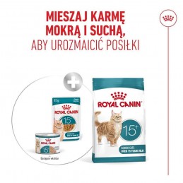 Karma ROYAL CANIN® AGEING 15+ dostępna jest zarówno w postaci suchej, jak i mokrej, w różnych wariantach: kawałki w sosie oraz delikatny mus. Karmienie mieszane pomaga pobudzić apetyt kota poprzez urozmaicenie konsystencji podawanego mu pokarmu i zaspokojenie jego indywidualnych preferencji.