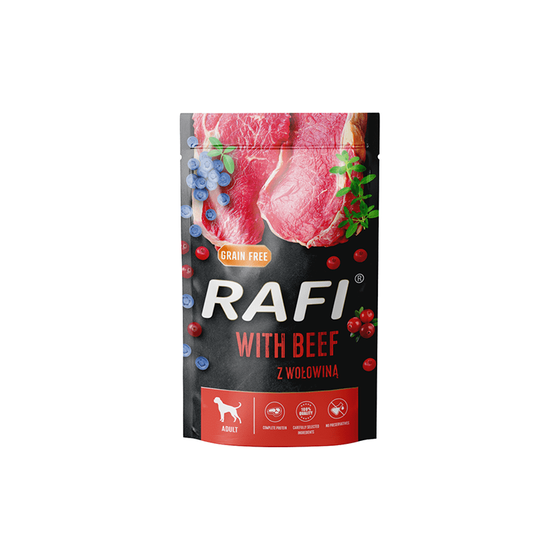 Mokra karma Rafi z wołowiną charakteryzuje się wysoką zawartością pełnowartościowego białka, przy niskiej zawartości tłuszczu. Oprócz tego mięso i surowce pochodzące z wołowiny są cennym źródłem lizyny i histydyny. Ważnymi substancjami są również kwasy tłuszczowe z rodzin n-3 i n-6, regulujące pracę wielu funkcji życiowych dorosłych psów. Karma zawiera żelazo zapewniające prawidłową gospodarkę krwi, a także selen i cynk, pokrywając dzienne zapotrzebowanie na te składniki. Receptura została wzbogacona o dodatek borówki i żurawiny, które dzięki występujących w nich związkach biologicznie czynnych, głównie procyjanidyn i flawonoidów, wykazują silne właściwości przeciwutleniające i przeciwzapalne. Tymianek z kolei działa antybakteryjnie i korzystnie wpływa na funkcje trawienne.