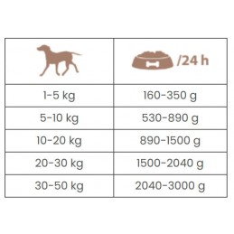 Podane ilości są orientacyjne. Rzeczywiste zapotrzebowanie jest zależne od rasy, wieku i aktywności psa.