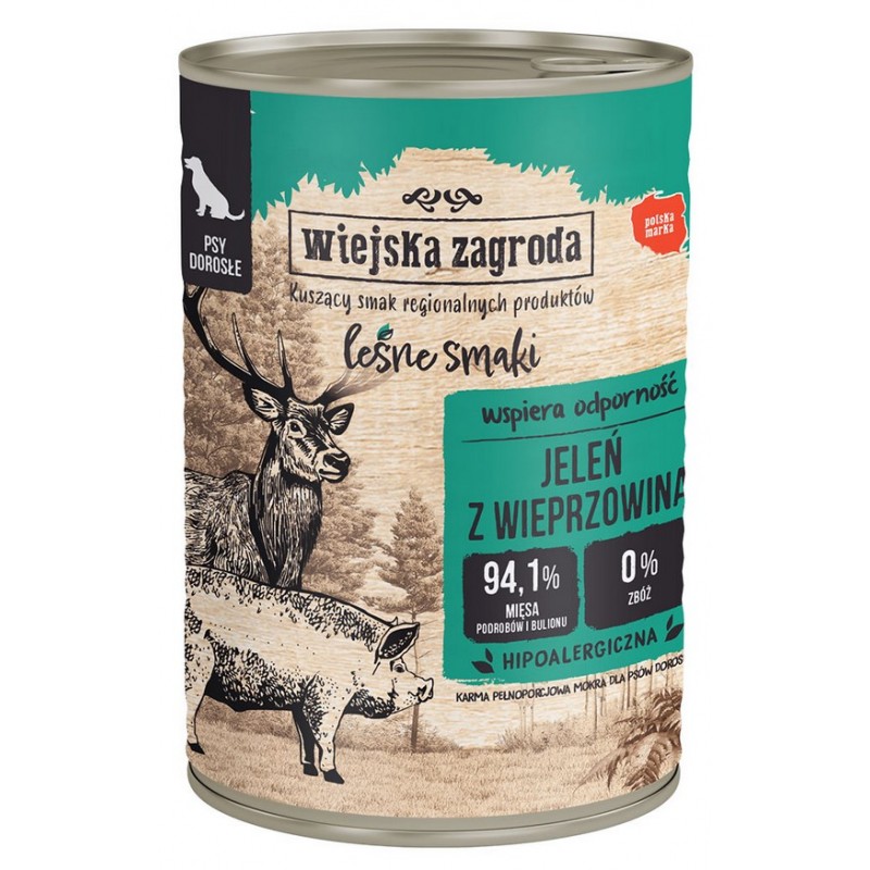 WIEJSKA ZAGRODA Leśne Smaki - Jeleń z Wieprzowiną to niezwykłe połączenie wybornego smaku z kompleksową dbałością o zdrowie Twojego wiernego przyjaciela. To nie tylko pełnowartościowa karma, ale także recepta na pełnię życia i witalności Twojego pupila.