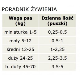 Każdy pies ma różne potrzeby. Optymalne ilości karmienia różnią się znacznie w zależności od takich czynników, jak wiek, aktywność, metabolizm i warunki środowiskowe. Jako punkt wyjścia proponujemy rozpocząć w dolnej wartości naszego przewodnika i dostosować odpowiednio do potrzeb.