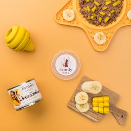 FAMILY FIRST Bogata w Kurczaka z burakami 200 g to pełnoporcjowa mokra karma stworzona specjalnie dla dorosłych psów małych ras, łącząca wysoką zawartość mięsa z funkcjonalnymi dodatkami wspierającymi zdrowie i witalność. Receptura bez pszenicy sprawia, że posiłek jest lekkostrawny i odpowiedni także dla wrażliwych psów.
