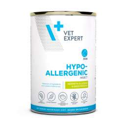 VETEXPERT 4T Vet. Diet Dog Hypoallergenic Insect Dog 375 g to specjalistyczna, pełnoporcjowa karma dietetyczna dla dorosłych psów, stworzona z myślą o redukcji nietolerancji pokarmowych oraz wsparciu zdrowia skóry i sierści. Formuła oparta na innowacyjnym źródle białka – larwach owadów Hermetia illucens – minimalizuje ryzyko reakcji alergicznych i stanowi doskonałe rozwiązanie dla psów z wrażliwym układem pokarmowym.