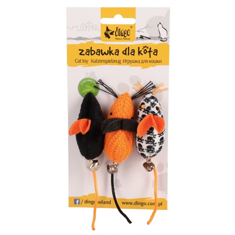 DINGO Zabawka Halloween – Myszki z Salem 3 szt. to uroczy i angażujący zestaw zabawek dla kota, który pobudza instynkt łowiecki, rozwija zwinność i stymuluje zmysły. Idealne do codziennej zabawy, zapewniają kotu aktywność i rozrywkę w halloweenowym klimacie.
