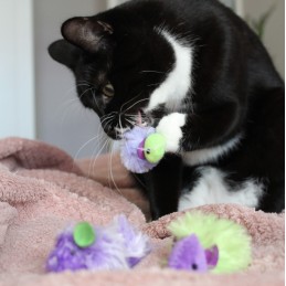 Zabawki zostały wykonane z wysokiej jakości, miękkich materiałów, a ich aromat kocimiętki skutecznie zachęca kota do polowania, gonienia i podrzucania. Dodatkowo każda myszka została wyposażona w mały dzwoneczek, który przy ruchu wydaje dźwięk przyciągający uwagę pupila i motywujący go do dalszej zabawy.