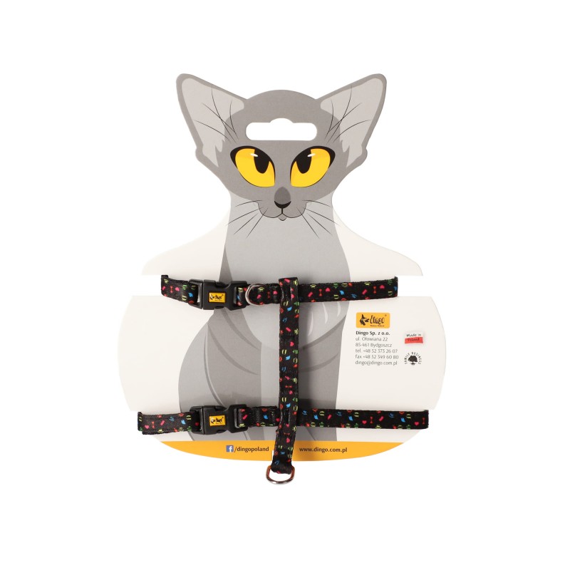 DINGO Szelki dla kota America Alabama to stylowe, wygodne i bezpieczne szelki spacerowe, zaprojektowane z myślą o kocich elegantach oraz ich codziennym komforcie. Wytrzymała taśma z nieścieralnym nadrukiem zachowuje intensywne kolory przez długi czas, dzięki czemu szelki (oraz pasująca smycz dostępna osobno) prezentują się świetnie nawet przy częstym użytkowaniu.