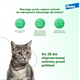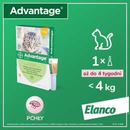 Advantage zabija pchły w ciągu 24 godzin od zastosowania i pozostaje aktywny przez 4 tygodnie.