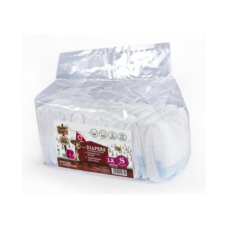 BARRY KING Pieluchy dla suczek to jednorazowe pampersy, które doskonale sprawdzą się w przypadkach nietrzymania moczu, podczas cieczki oraz u zwierząt po operacji. Wysoka chłonność zapewnia suchość i komfort, a otwór na ogon, ściągacze przy łapach i udach oraz boczne mocowanie na rzepy gwarantują idealne dopasowanie i stabilność. Opakowanie zawiera 12 sztuk, które skutecznie zadbają o higienę Twojego pupila.