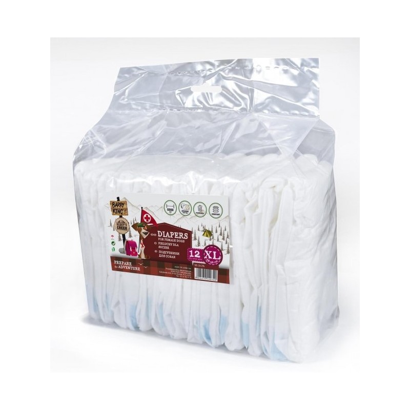 BARRY KING Pieluchy dla suczek to jednorazowe pampersy, które doskonale sprawdzą się w przypadkach nietrzymania moczu, podczas cieczki oraz u zwierząt po operacji. Wysoka chłonność zapewnia suchość i komfort, a otwór na ogon, ściągacze przy łapach i udach oraz boczne mocowanie na rzepy gwarantują idealne dopasowanie i stabilność. Opakowanie zawiera 12 sztuk, które skutecznie zadbają o higienę Twojego pupila.