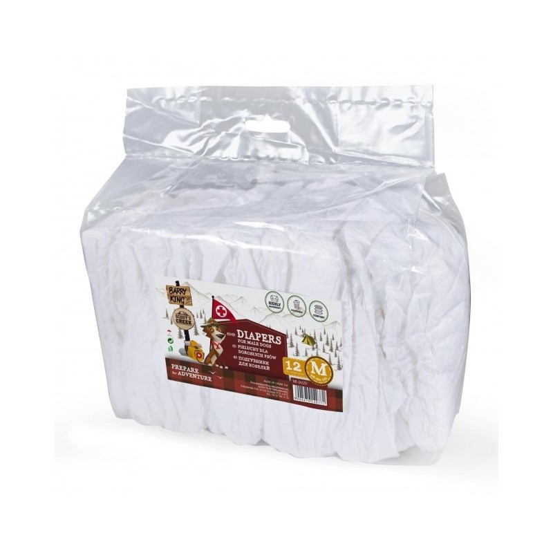 BARRY KING Pieluchy dla psów to jednorazowe pampersy, idealne w przypadkach nietrzymania moczu oraz dla psów po operacjach. Dzięki wysokiej chłonności zapewniają suchość i komfort, a otwór na ogon oraz ściągacze przy łapach i udach gwarantują doskonałe przyleganie. Boczne mocowanie na rzepy umożliwia idealne dopasowanie. Opakowanie zawiera 12 sztuk, zapewniając skuteczną ochronę i higienę Twojego pupila.