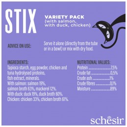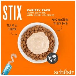 Kremowe przysmaki dla kota SCHESIR Stix w multipacku – kurczak, kaczka i łosoś, bogate w białko, idealne do podania z saszetki lub jako dodatek do karmy, wspierające nawodnienie kota.