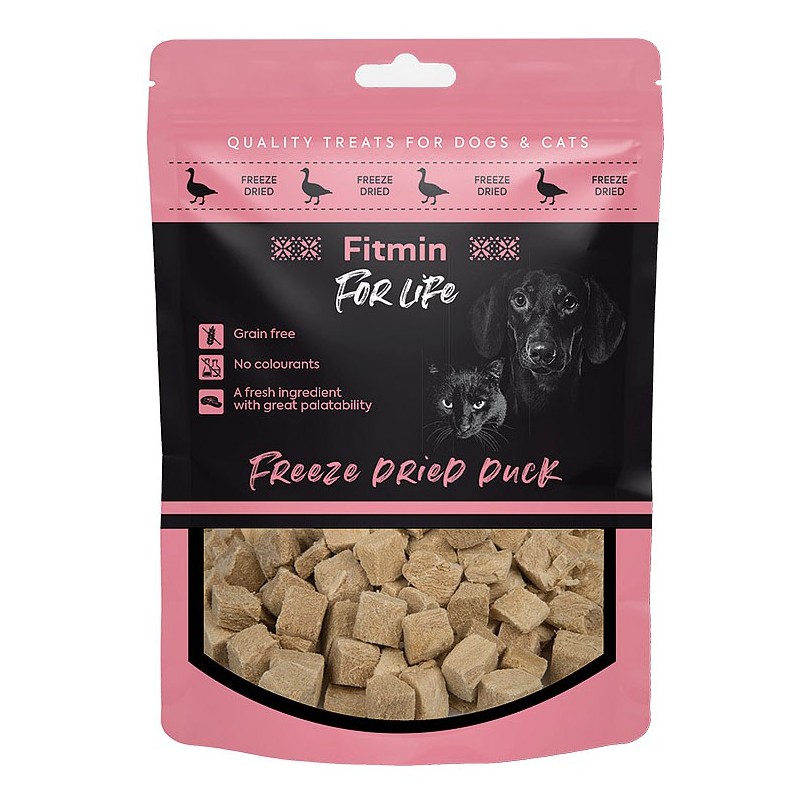 Suszone przysmaki marki Fitmin pokocha każdy pies i kot. Składają się w 100% z mięsa kaczki, a dzięki suszeniu metodą liofilizacji zachowują swój niesamowity smak. Przysmaki te świetnie sprawdzą się jako nagroda np. przy treningu. Produkt jest w 100% naturalny, nie zawiera konserwantów, gliceryny, aromatów czy sztucznych barwników. Dodatkowo opakowanie ma bardzo wygodne zamknięcie strunowe co ułatwia przechowywanie. Twój czworonożny przyjaciel pokocha te przysmaki.
