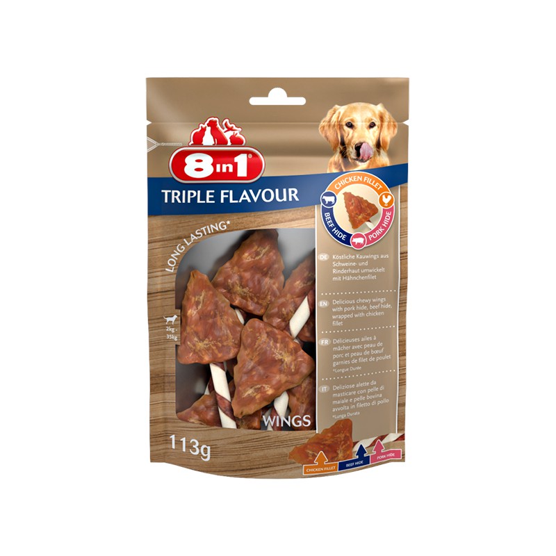 Twój czworonożny przyjaciel pokocha tę pyszną alternatywę dla żeberek! Pyszny, trójwarstwowy przysmak do żucia z dużymi kawałkami smakowitego fileta z kurczaka, ze skórą wieprzową i skórą wołową.