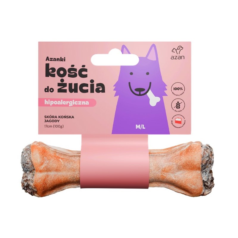 AZANKI Kość Hipoalergiczna ze Skóry Końskiej z Jagodami to wyjątkowy przysmak stworzony specjalnie dla dorosłych psów średnich i dużych ras. Ta karma uzupełniająca nie tylko zaspokaja naturalną potrzebę żucia, ale również wspiera zdrowie i dobre samopoczucie Twojego psa dzięki starannie dobranym, naturalnym składnikom.