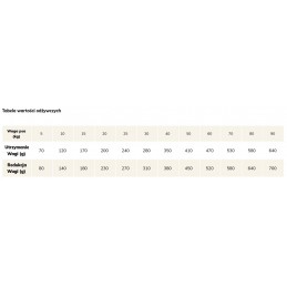 -białko surowe 27,0%, zawartość tłuszczu 12,0%, włókno surowe 5,0%, popiół surowy 7,5%, wilgotność 10,0%, omega-3 0,7%, omega-6 0,85%, EPA (20: 5 n3) 0,2%, DHA (22: 6 n3) 0,4%, wapń 1,6%, fosfor 1,1%, Kwasy tłuszczowe Omega-6:0.8%, Kwasy tłuszczowe Omega-3:0.7%.