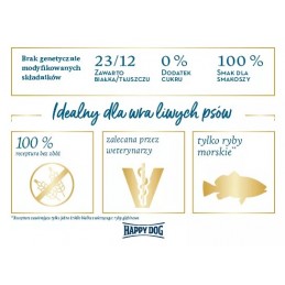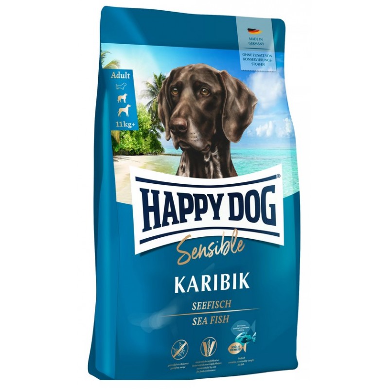 HAPPY DOG Sensible Karibik to zaawansowana formuła suchej karmy, specjalnie zaprojektowana dla dorosłych psów ważących ponad 11 kg. Wyjątkowa opcja żywnościowa, opierająca się na rybach morskich, jest doskonałym rozwiązaniem dla zwierząt borykających się z alergiami i nietolerancjami pokarmowymi. Wykonana z najwyższej klasy składników, karmy dostarcza psom esencjonalnych białek zwierzęcych oraz niezbędnych kwasów tłuszczowych omega-3 i omega-6, które są fundamentalne dla zachowania zdrowej skóry i pięknej sierści.