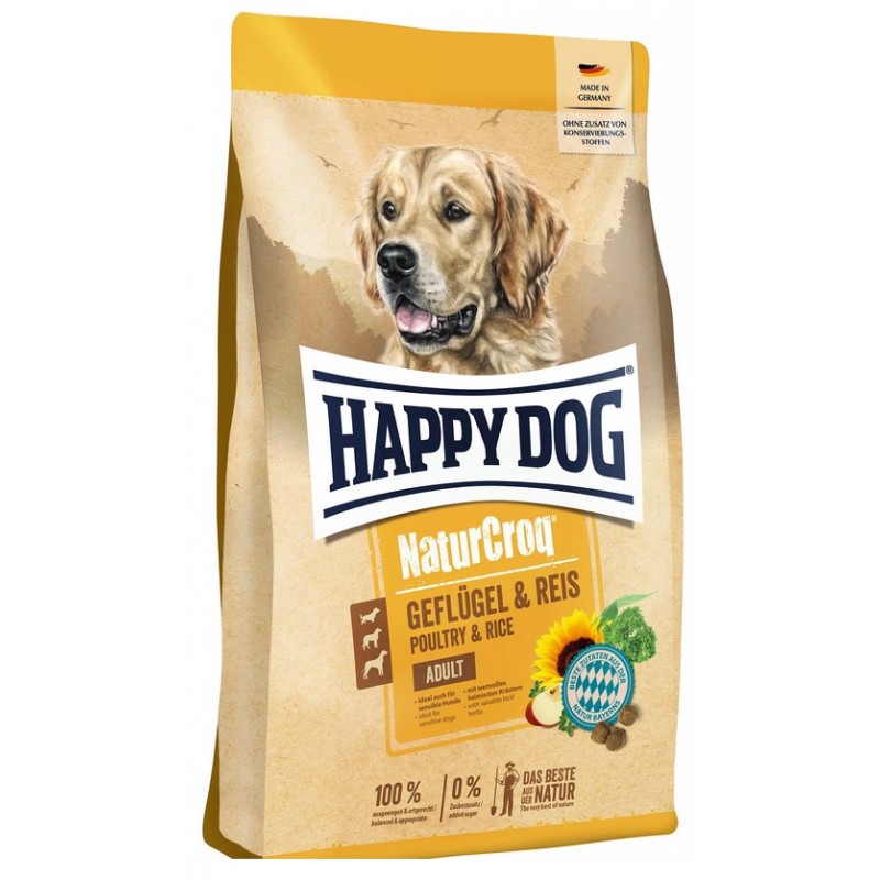 HAPPY DOG NaturCroq Poultry & Rice to wysoko ceniona sucha karma dla dorosłych psów, skomponowana z drobiu i ryżu. Lekkostrawna karma została stworzona z użyciem wyłącznie wysokiej jakości składników, co gwarantuje pełnowartościowe odżywianie bez obciążania układu pokarmowego. Jest całkowicie pozbawiona glutenu, co sprawia, że jest idealnym wyborem dla psów z wrażliwymi jelitami oraz tych, którzy mają specyficzne wymagania dietetyczne.