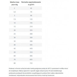 - białko surowe 23,0 %, tłuszcz surowy 10,0 %, włókno surowe 2,0 %, popiół surowy 6,5 %, wapń 1,35 %, fosfor 0,8 %, sód 0,25 %, potas 0,5 %, magnez 0,08 %, kwasy tłuszczowe omega-6 2,2 %, kwasy tłuszczowe omega-3 0,2 %,
