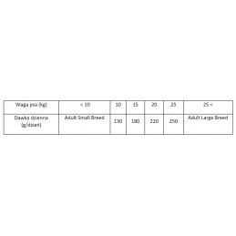 Zalecane dzienne dawki podane w tabeli dawkowania należy podzielić na 1-2 równych porcji i podawać w ciągu dnia. Karmę można podawać suchą lub zwilżoną letnią wodą. Jeśli karma Brit Care jest podawana po raz pierwszy, należy wymieszać ją z dotychczas podawaną karmą i stopniowo w ciągu 7 dni zwiększać dawkę karmy Brit Care. Dzienna dawka może się różnić w zależności od środowiska, aktywności i wieku Twojego psa.