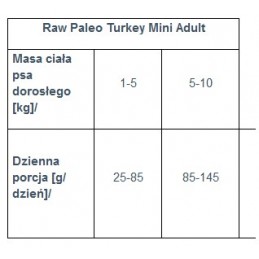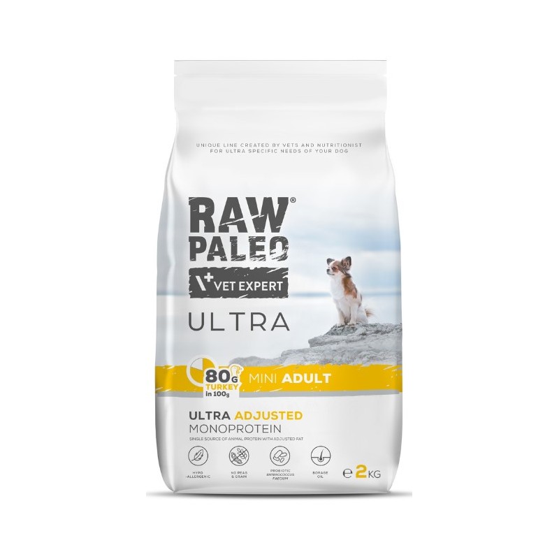 Karma RAW PALEO Ultra Turkey Mini Adult to kompletny pokarm dla dorosłych psów małych ras. Zaprojektowany z myślą o zwierzętach z wrażliwym systemem trawiennym, oferujący składniki monoproteinowe i hipoalergiczne. Bezbłędnie dobrane składniki, bez grochu i zbóż, z dodatkiem oleju z ogórecznika, gwarantują utrzymanie zdrowej skóry i zapewniają piękną, lśniącą sierść.