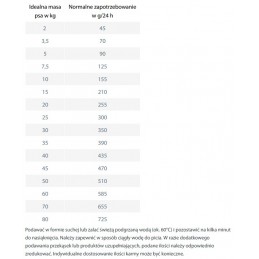 - białko surowe 22,0 %, tłuszcz surowy 9,0 %, włókna surowe 3,0 %, popiół surowy 5,0 %, wapń 0,9 %, fosfor 0,6 %, sód 0,25 %, potas 0,6 %, magnez 0,1 %, kwasy tłuszczowe omega-6 1,5 %, kwasy tłuszczowe omega-3 0,2 %,