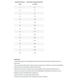 - białko surowe 12,5 %, tłuszcz surowy 14,0 %, włókno surowe 2,0 %, popiół surowy 3,5 %, wapń 0,45 %, sód 0,25 %, potas 0,6 %, magnez 0,07 %, fosfor 0,35 %, kwasy tłuszczowe omega-6 2,5 %, kwasy tłuszczowe omega-3 0,3 %,