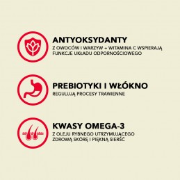 Kompozycja uzupełniona jest wartościowymi warzywami, owocami i ziołami, takimi jak świeża cała dynia, świeża cała marchew, świeże całe gruszki, świeży jarmuż, suszony korzeń cykorii, cała żurawina, całe borówki, ostropest plamisty, lawenda, które wpływają korzystnie na organizm psa.