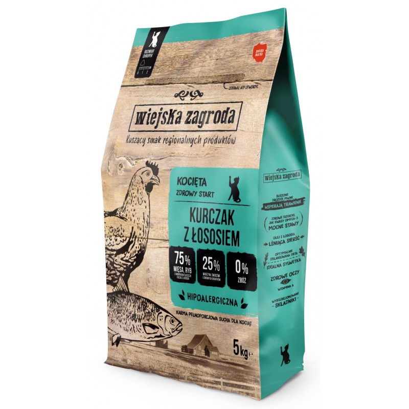 Wiejska Zagroda to pełnoporcjowa karma o smaku kurczaka z łososiem dla kociąt.