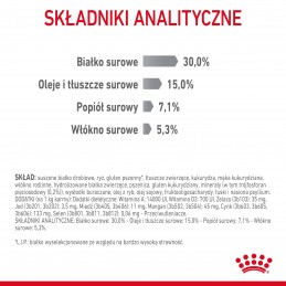 - suszone białko drobiowe, ryż, gluten pszenny*, tłuszcz zwierzęcy, kukurydza, mączka kukurydziana, włókna roślinne, hydrolizat białka zwierzęcego, pszenica, gluten kukurydziany, składniki mineralne (w tym trifosforan pentasodu; 0,2%), pulpa buraczana, olej rybny, olej sojowy, fruktooligosacharydy, psyllium (łuski i nasiona).