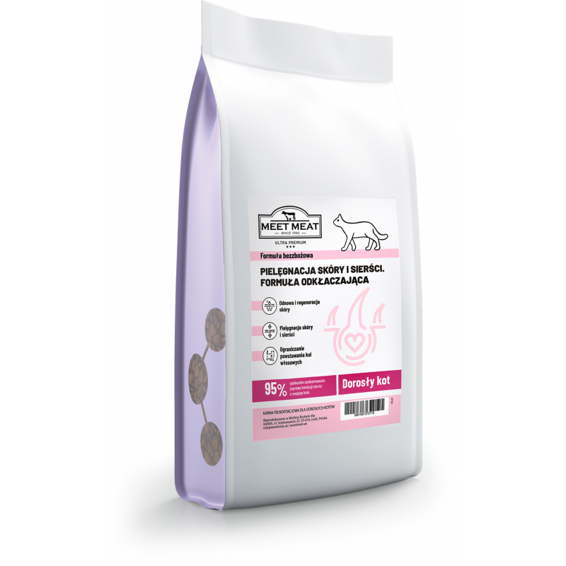 Meet Meat Peptide+ Skin & Coat Hairball to pełnoporcjowa sucha karma dla kotów dorosłych, opracowana z myślą o kompleksowym wsparciu kondycji skóry i sierści oraz ograniczeniu powstawania kul włosowych. Receptura została zaprojektowana tak, aby odpowiadać na potrzeby kotów liniejących, długowłosych oraz tych, które mają tendencję do odkładania sierści w przewodzie pokarmowym.