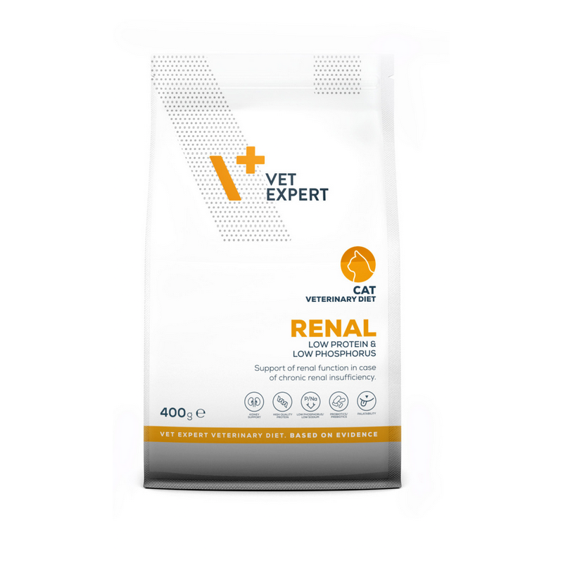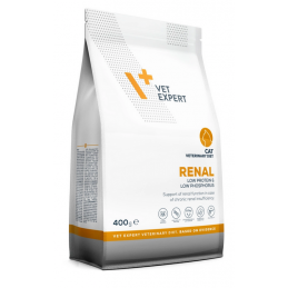 VETEXPERT 4T Vet. Diet Renal Cat 400 g to pełnoporcjowa i zbilansowana karma dietetyczna dla kotów dorosłych, opracowana w celu wsparcia funkcji nerek w przypadku ich przewlekłej niewydolności. To specjalistyczna dieta, która pomaga odciążyć organizm i wspiera codzienny komfort życia kota z problemami nefrologicznymi.